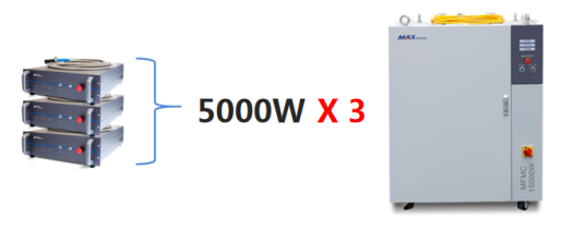 單模塊功率越大,在集成萬瓦超高功率激光器時所需的模塊更少,結構更緊湊,并且合束規(guī)格越小,合束效率越高,性能更穩(wěn)定。以15000W超高功率光纖激光器為例,只需要3個單模塊5000W即可合束而成。